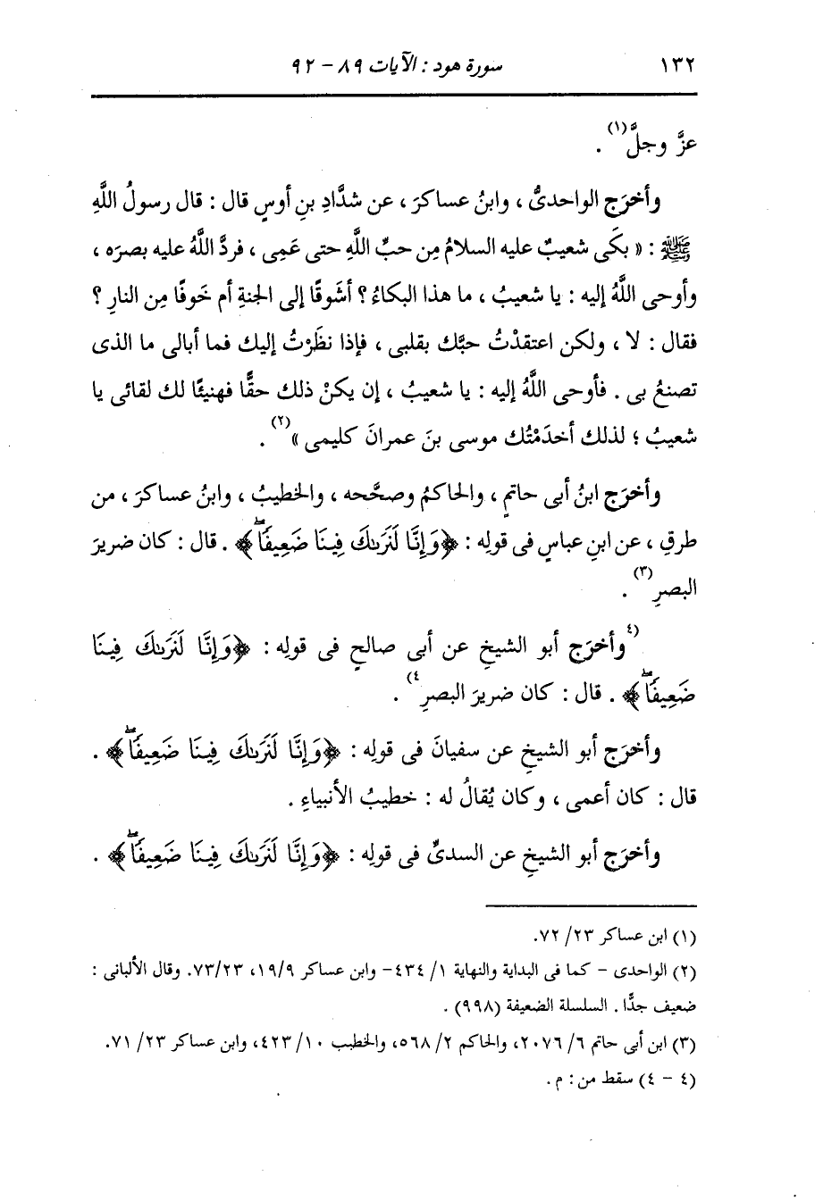 وأخرج أبو الشيخ عن سفيان في قوله {وإنا لنراك فينا ضعيفا} قال : كان أعمى وكان يقال له : خطيب الأنبياء عليهم السلام.