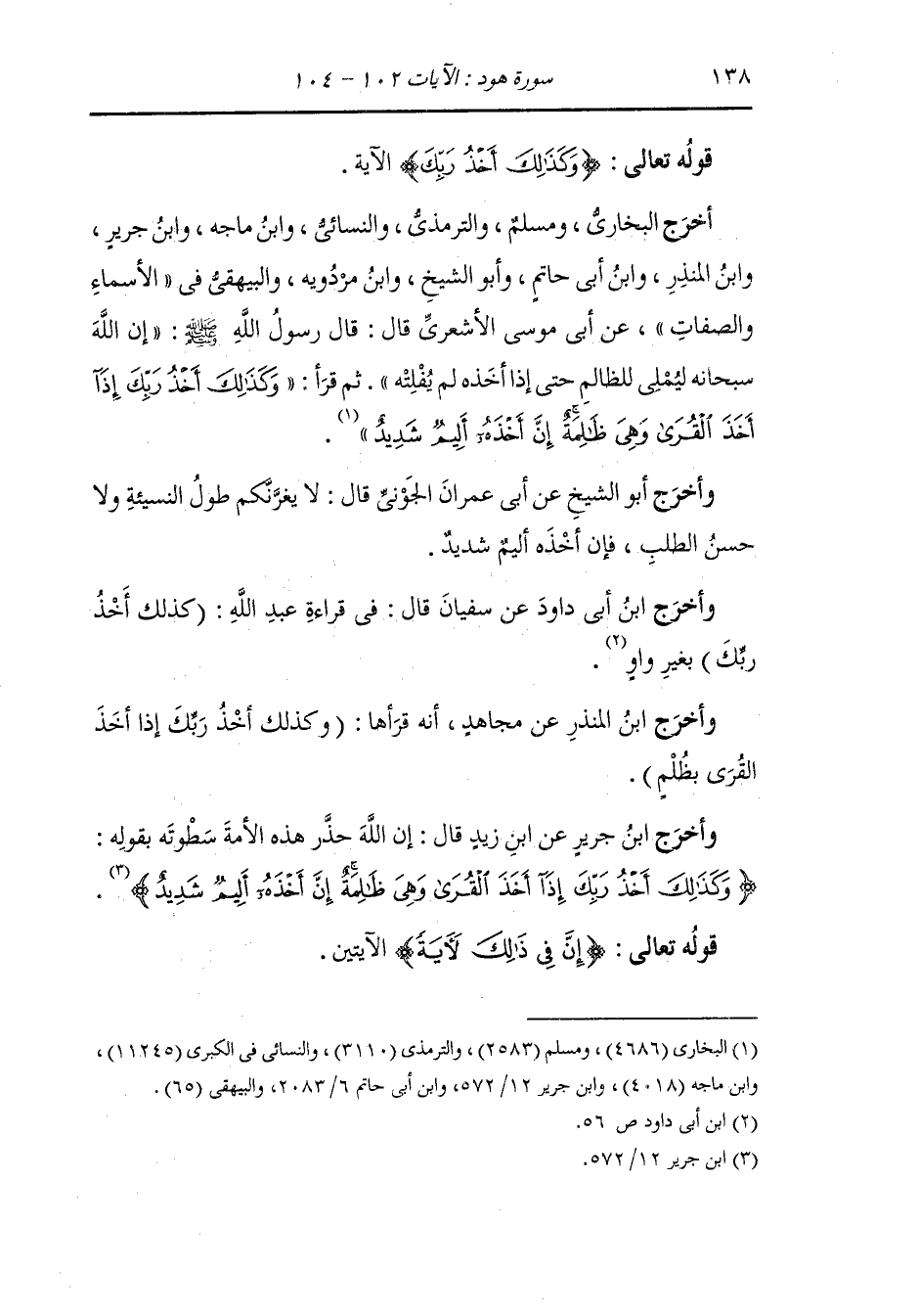 أَخرَج البخاري ومسلم والترمذي والنسائي ، وَابن ماجة ، وَابن جَرِير ، وَابن المنذر ، وَابن أبي حاتم وأبو الشيخ ، وَابن مردويه والبيهقي في الأسماء والصفات عن أبي موسى الأشعري رضي الله عنه قال : قال رسول الله صلى الله عليه وسلم إن الله سبحانه ليملي للظالم حتى إذا أخذته لم يفلته ثم قرأ {وكذلك أخذ ربك إذا أخذ القرى وهي ظالمة إن أخذه أليم شديد}.