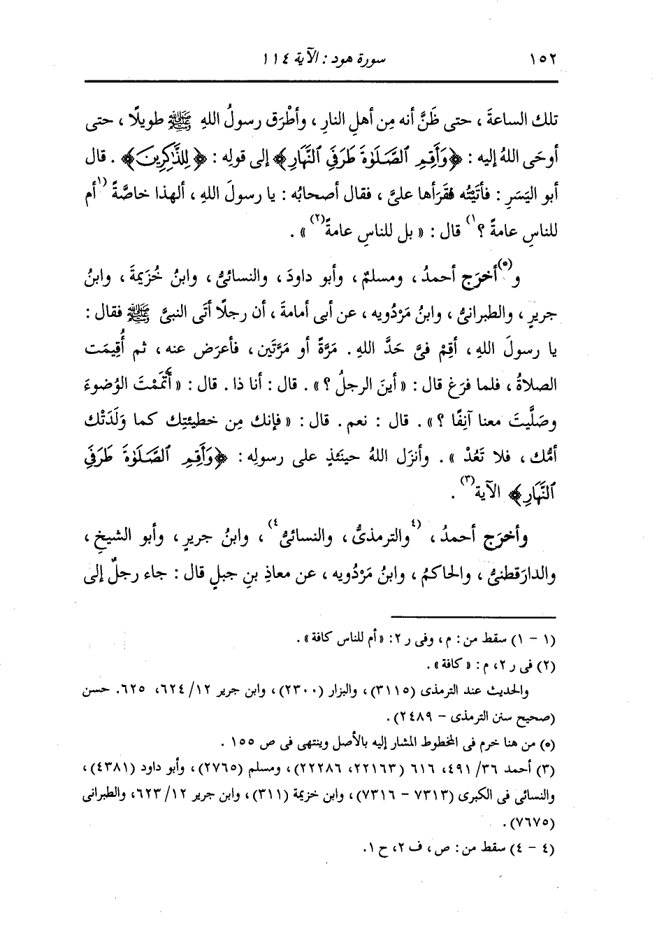 وأخرج أحمد ومسلم وأبو داود والنسائي ، وَابن خزيمة ، وَابن جَرِير والطبراني ، وَابن مردويه عن أبي أمامة رضي الله عنه ، أن رجلا أتى النَّبِيّ صلى الله عليه وسلم فقال : يا رسول الله أقم في حد الله مرة أو مرتين ، فأعرض عنه ثم أقيمت الصلاة فلما فرغ قال أين الرجل قال : أنا ذا ، قال : أتممت الوضوء وصليت معنا آنفا قال : نعم ، قال : فإنك من خطيئتك كما ولدتك أمك فلا تعد وأنزل الله حينئذ على رسول الله صلى الله عليه وسلم {وأقم الصلاة طرفي النهار} الآية.