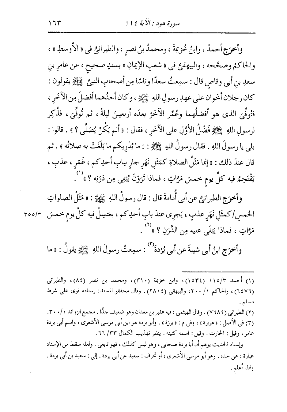وأخرج أحمد ، وَابن خزيمة ومحمد بن نصر والطبراني في الأوسط والحاكم وصححه والبيهقي في شعب الإيمان بسند صحيح عن عامر بن سعد بن أبي وقاص قال : سمعت سعدا وناسا من أصحاب النَّبِيّ صلى الله عليه وسلم يقولون : كان رجلان أخوان على عهد رسول الله صلى الله عليه وسلم وكان أحدهما أفضل من الآخر فتوفي الذي هو أفضلهما وعمر الآخر بعده أربعين ليلة ثم توفي فذكر لرسول الله صلى الله عليه وسلم فضل الأول على الآخرة قال ألم يكن يصلي قالوا : بلى يا رسول الله ، فقال رسول الله صلى الله عليه وسلم : ما يدريكم ما بلغت به صلاته ثم قال عند ذلك : إنما مثل الصلوات كمثل نهر جار بباب أحدكم غمر عذب يقتحم فيه كل يوم خمس مرات فماذا ترون يبقى من درنه.