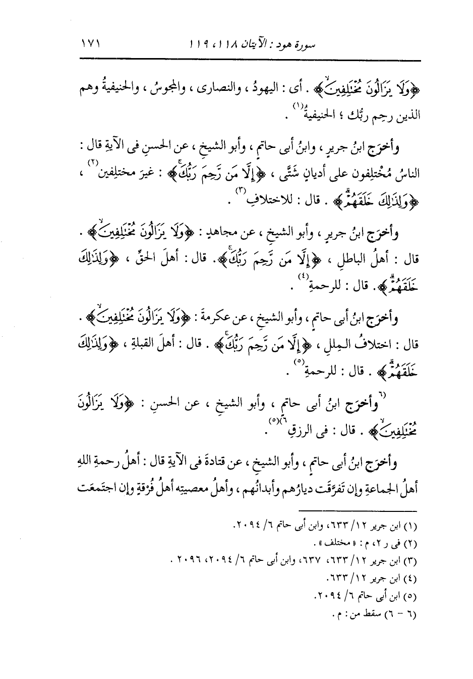 وأخرج ابن جرير ، وَابن أبي حاتم وأبو الشيخ عن الحسن في الآية قال : الناس مختلفون على أديان شتى إلا من رحم ربك غير مختلف {ولذلك خلقهم} قال : للإختلاف.
