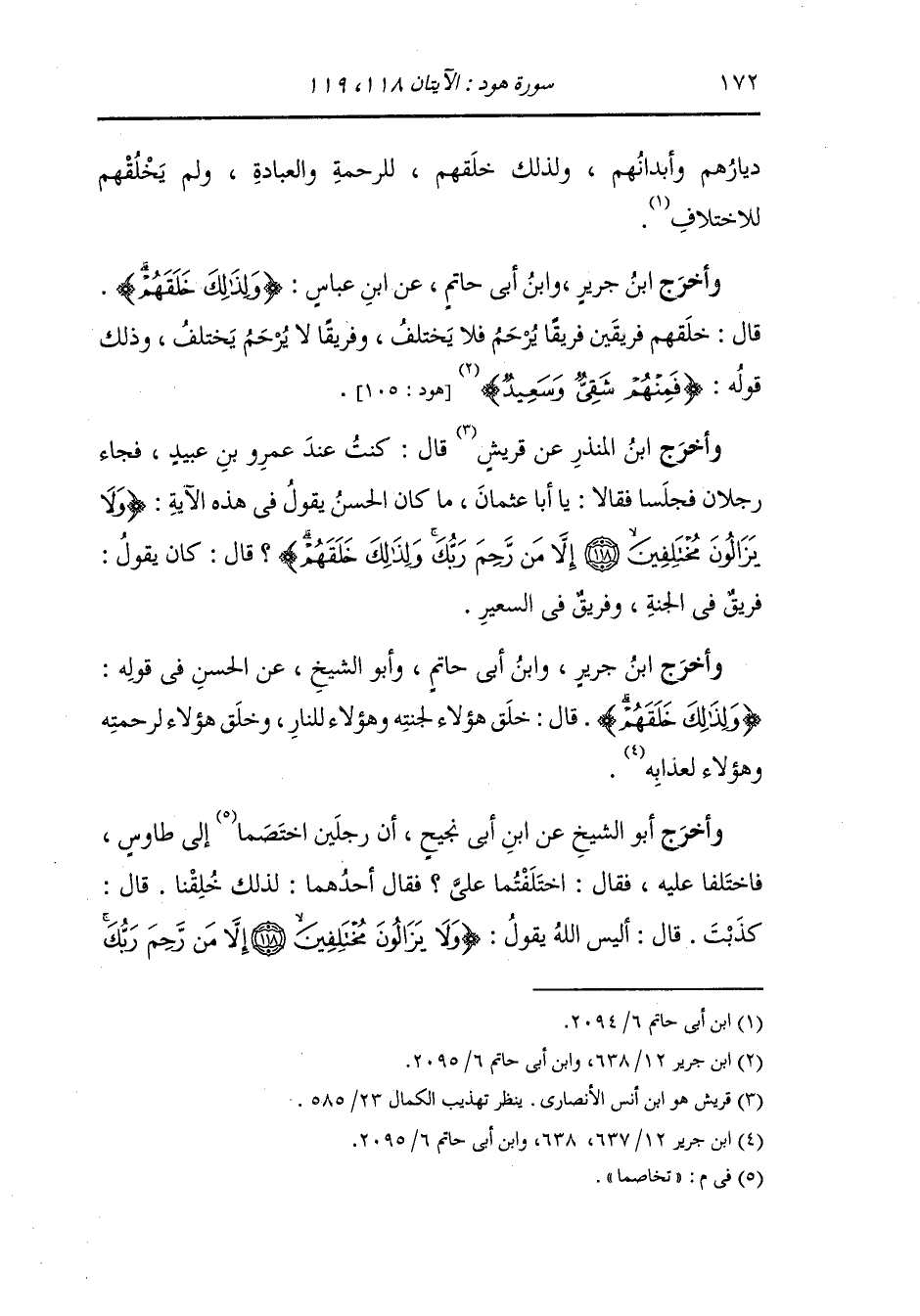 وأخرج ابن المنذر عن قريش قال : كنت عند عمرو بن عبيد فجاء رجلان فجلسا فقالا : يا أبا عثمان ما كان الحسن يقول في هذه الآية {ولا يزالون مختلفين إلا من رحم ربك ولذلك خلقهم} قال : كان يقول (فريق في الجنة وفريق في السعير) (الشورى الآية 7).