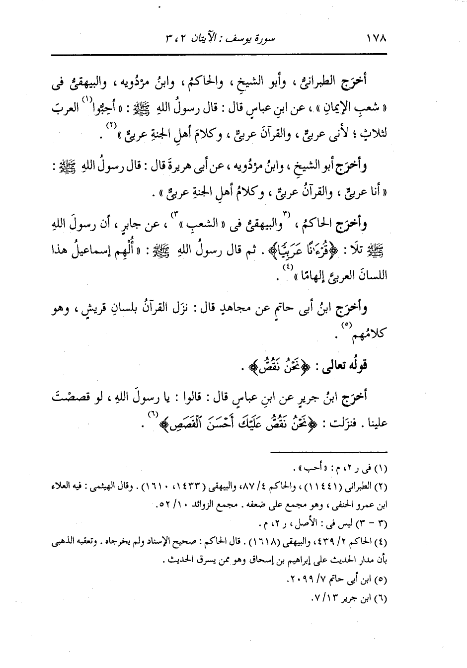أخرج الطبراني وأبو الشيخ والحاكم ، وَابن مردويه والبيهقي في شعب الإيمان عن ابن عباس رضي الله عنهما قال : قال رسول الله صلى الله عليه وسلم أحب العرب لثلاث : لأني عربي والقرآن عربي وكلام أهل الجنة عربي.