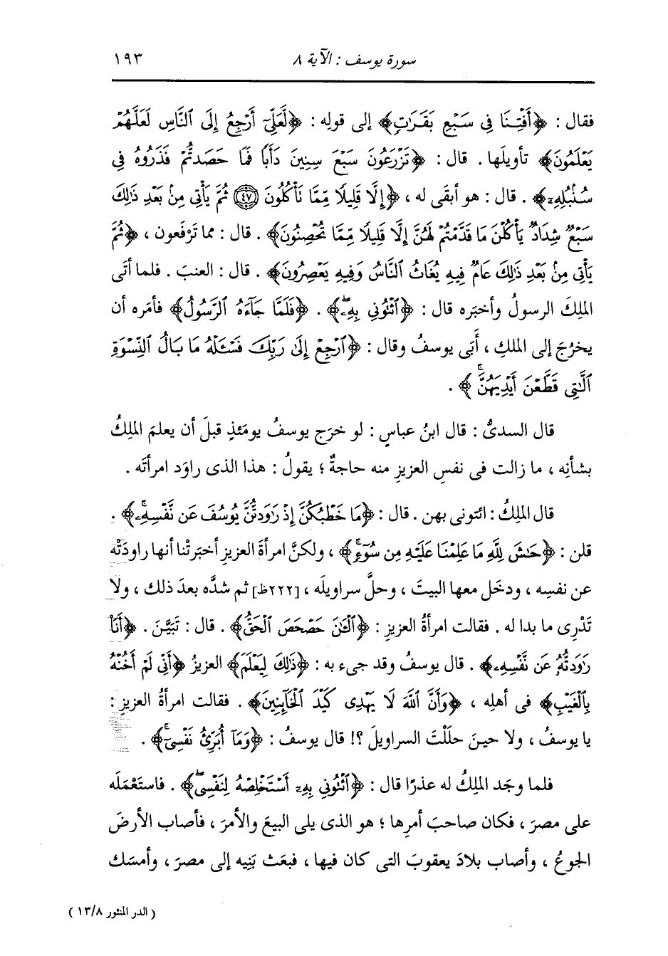 فقال {أفتنا في سبع بقرات} إلى قوله {لعلي أرجع إلى الناس لعلهم يعلمون} تأويلها {قال تزرعون سبع سنين دأبا فما حصدتم فذروه في سنبله} قال هو أبقى له {إلا قليلا مما تأكلون ثم يأتي من بعد ذلك سبع شداد يأكلن ما قدمتم لهن إلا قليلا مما تحصنون} قال : مما ترفعون {ثم يأتي من بعد ذلك عام فيه يغاث الناس وفيه يعصرون} قال : العنب فلما أتى الملك الرسول وأخبره قال : {ائتوني به فلما جاءه الرسول} فأمره أن يخرج إلى الملك أبى يوسف وقال : {ارجع إلى ربك فاسأله ما بال النسوة اللاتي قطعن أيديهن} ، قال السدي : قال ابن عباس رضي الله عنهما : لو خرج يوسف يومئذ قبل أن يعلم الملك بشأنه ما زالت في نفس العزيز منه حاجة يقول هذا الذي راود امرأته ، قال الملك ائتوني بهن {قال ما خطبكن إذ راودتن يوسف عن نفسه قلن حاش لله ما علمنا عليه من سوء} ولكن امرأة العزيز أخبرتنا أنها راودته عن نفسه ودخل معها البيت وحل سراويله ثم شده بعد ذلك ولا تدري ما بدا له ، فقالت امرأة العزيز {الآن حصحص الحق} قال تبين ، {أنا راودته عن نفسه} قال يوسف - وقد جيء به - ذلك ليعلم العزيز {أني لم أخنه بالغيب} في أهله {وأن الله لا يهدي كيد الخائنين} ، فقالت امرأة العزيز : يا يوسف ولا حين حللت السراويل قال يوسف عليه السلام : {وما أبرئ نفسي} ، فلما وجد الملك له عذرا قال : {ائتوني به أستخلصه لنفسي} فأستعمله على مصر فكان صاحب أمرها هو الذي يلي البيع والأمر فأصاب الأرض الجوع وأصاب بلاد يعقوب التي كان فيها فبعث بنيه إلى مصر وأمسك