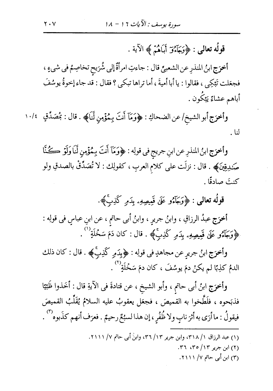 وأخرج ابن أبي حاتم وأبو الشيخ عن قتادة رضي الله عنه في الآية قال : أخذوا ظبيا فذبحوه فلطخوا به القميص فجعل يعقوب عليه السلام يقلب القميص فيقول : ما أرى أثر أثر ناب ولا ظفر إن هذا السبع رحيم ، فعرف أنهم كذبوه