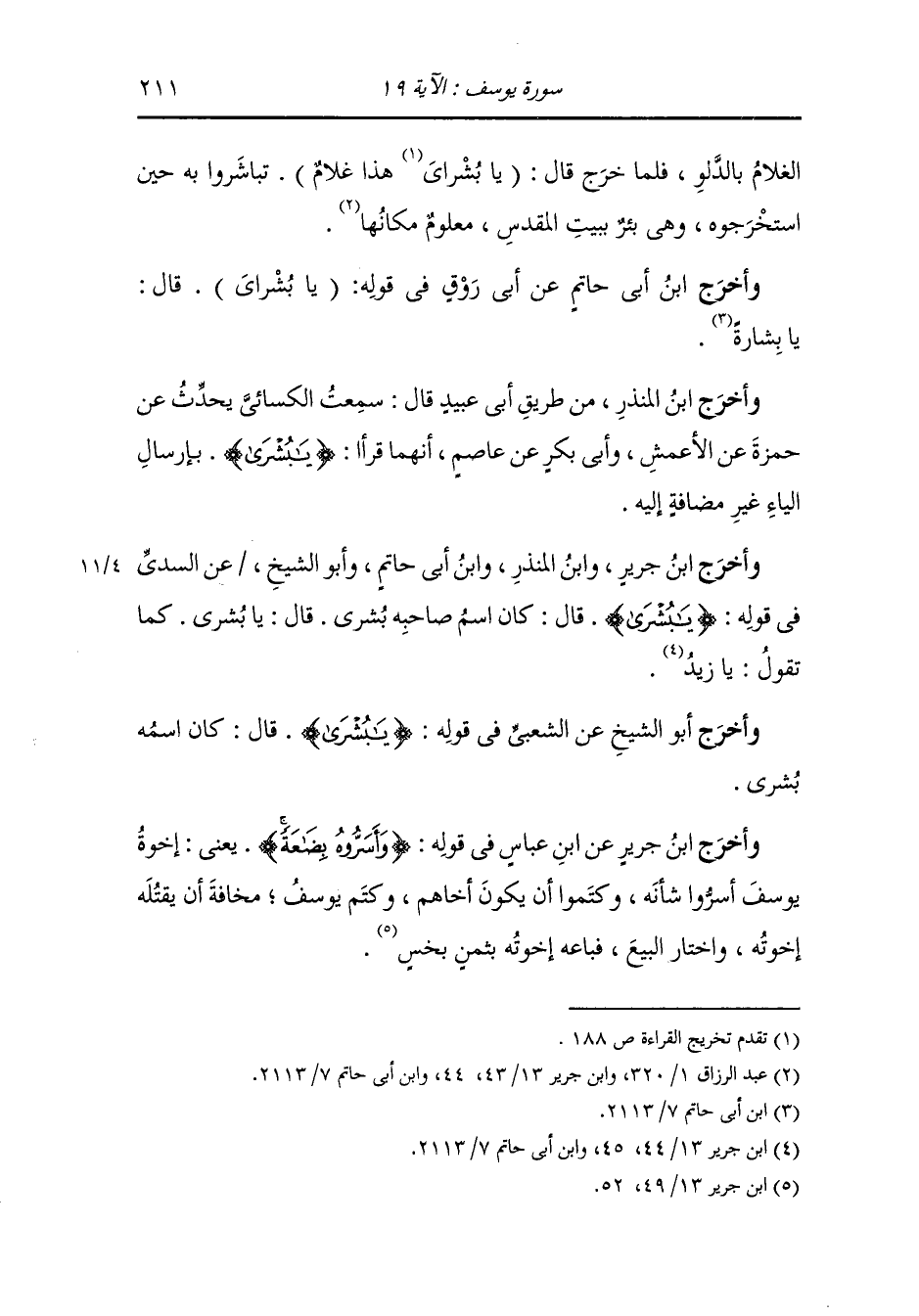 وأخرج ابن جرير ، وَابن المنذر ، وَابن أبي حاتم وأبو الشيخ عن السدي في قوله {يا بشرى} قال : كان اسم صاحبه بشرى ، قال : يا بشرى كما تقول يا زيد.
