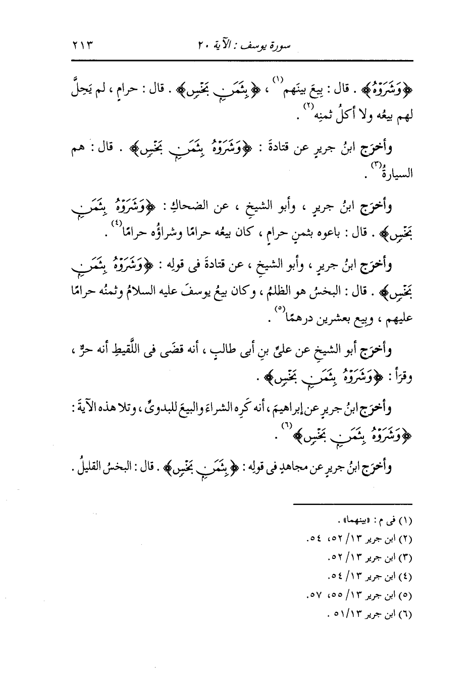 وأخرج ابن جرير وأبو الشيخ عن قتادة رضي الله عنه في قوله {وشروه بثمن بخس} قال : البخس هو الظلم ، وكان بيع يوسف عليه السلام وثمنه حراما عليهم وبيع بعشرين درهما.