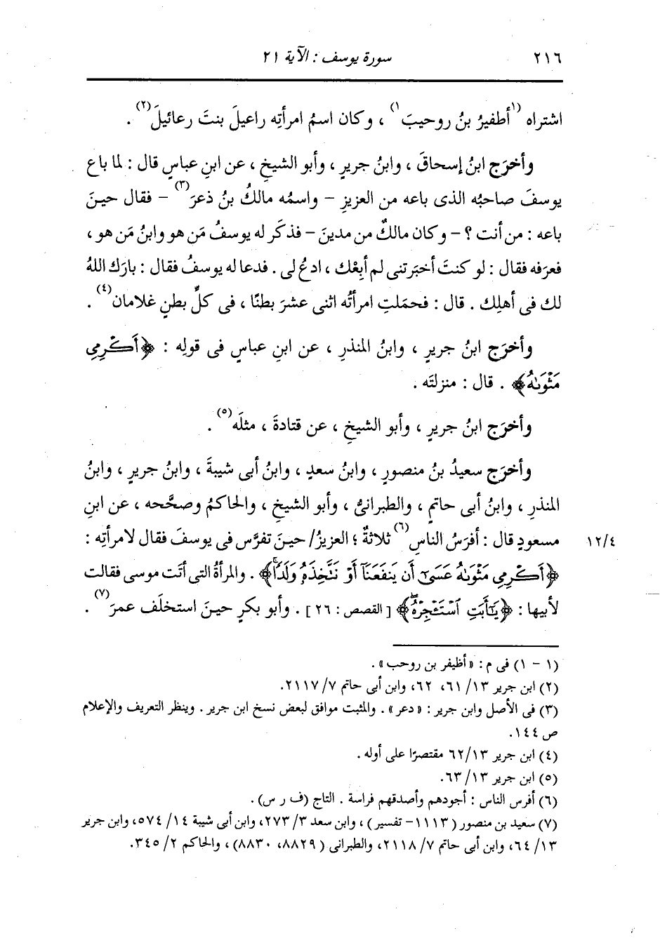وأخرج ابن إسحاق ، وَابن جَرِير وأبو الشيخ عن ابن عباس رضي الله عنهما قال : لما باع يوسف صاحبه الذي باعه من العزيز - واسمه مالك بن ذعر - قال حين باعه : من أنت - وكان مالك من مدين - فذكر له يوسف من هو ، وَابن من هو فعرفه فقال : لو كنت أخبرتني لم أبعك ، ادع لي فدعا له يوسف فقال : بارك الله لك في أهلك ، قال : فحملت امرأته اثني عشر بطنا في كل بطن غلامان.