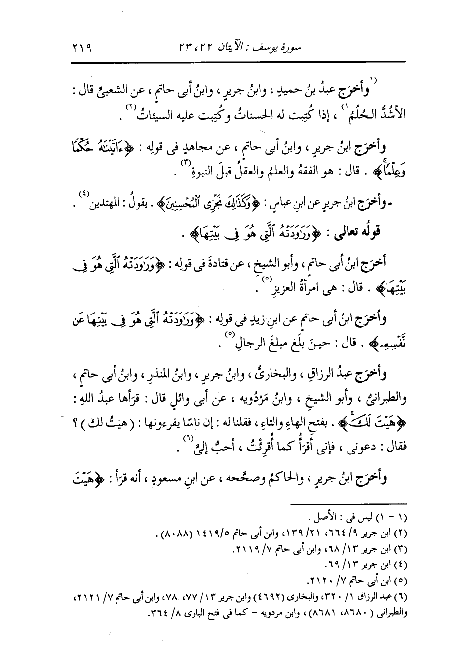 وأخرج عبد الرزاق والبخاري ، وَابن جَرِير ، وَابن المنذر ، وَابن أبي حاتم والطبراني وأبو الشيخ ، وَابن مردويه عن أبي وائل رضي الله عنه قال : قرأها عبد الله {هيت لك} بفتح الهاء والتاء فقلنا له : إن ناسا يقرؤونها {هيت لك} فقال : دعوني فإني أقرأ كما أقرئت أحب إلي.