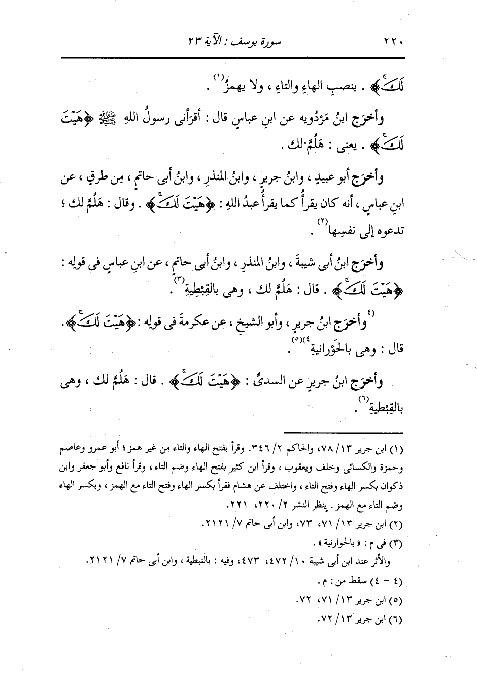وأخرج أبو عبيد ، وَابن جَرِير ، وَابن المنذر ، وَابن أبي حاتم من طرق عن ابن عباس رضي الله عنهما أنه كان يقرأ كما يقرأ عبد الله {هيت لك} وقال : هلم لك تدعوه إلى نفسها.