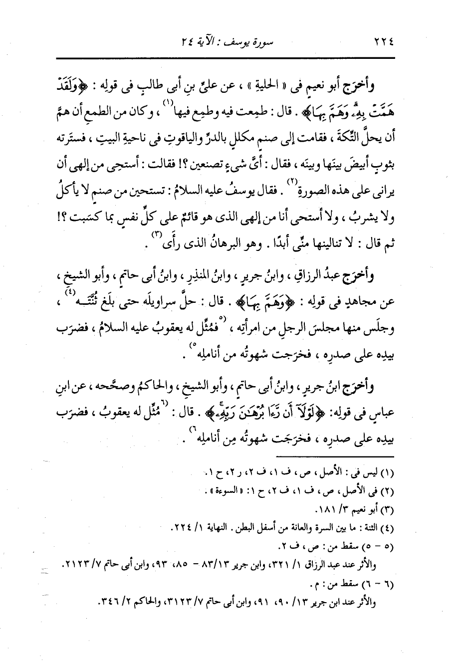 وأخرج أبو نعيم في الحلية عن علي بن أبي طالب رضي الله عنه في قوله {ولقد همت به وهم بها} قال : طمعت فيه وطمع فيها وكان من الطمع أن هم بحل التكة فقامت إلى صنم مكلل بالدر والياقوت في ناحية البيت فسترته بثوب أبيض بينها وبينه فقال : أي شيء تصنعين فقالت : أستحي من إلهي أن يراني على هذه الصورة ، فقال يوسف عليه السلام : تستحين من صنم لا يأكل ولا يشرب ولا أستحي أنا من إلهي الذي هو قائم على كل نفس بما كسبت ، ثم قال : لا تنالينها مني أبدا ، وهو البرهان الذي رأى.