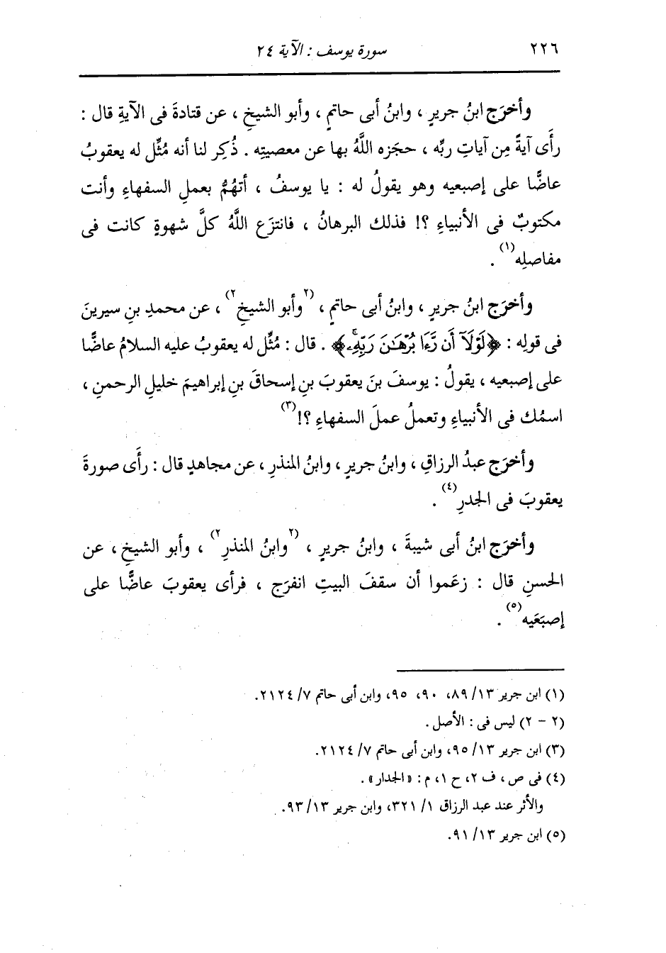 وأخرج ابن جرير ، وَابن أبي حاتم وأبو الشيخ عن محمد بن سيرين رضي الله عنه في قوله {لولا أن رأى برهان ربه} قال : مثل له يعقوب عليه السلام عاضا على أصبعيه يقول : يوسف بن يعقوب بن إسحاق بن إبراهيم خليل الرحمن اسمك في الأنبياء وتعمل عمل السفهاء ،.