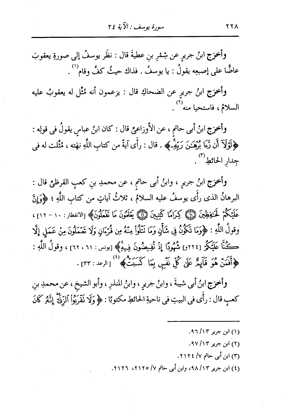 وأخرج ابن جرير ، وَابن أبي حاتم عن محمد بن كعب القرظي رضي الله عنه قال : البرهان الذي رأى يوسف عليه السلام ثلاث آيات من كتاب الله (وإن عليكم لحافظون كراما كاتبين يعلمون ما تفعلون) (الإنفطار الآيات 10 - 11 - 12) وقول الله (وما تكون في شأن وما تتلو منه من قرآن ولا تعلمون من عمل إلا كنا عليكم شهودا إذ تفيضون فيه) (يونس الآية 61 - 62) وقول الله (أفمن هو قائم على كل نفس بما كسبت) (الرعد الآية 33).
