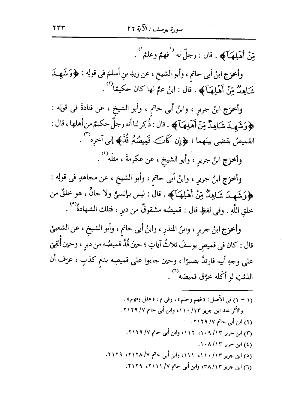 وأخرج ابن جرير ، وَابن أبي حاتم وأبو الشيخ عن قتادة رضي الله عنه في قوله {وشهد شاهد من أهلها} قال : ذكر لنا أنه رجل حكيم من أهلها ، قال : القميص يقضي بينهما إن كان قميصه قد إلى آخره.