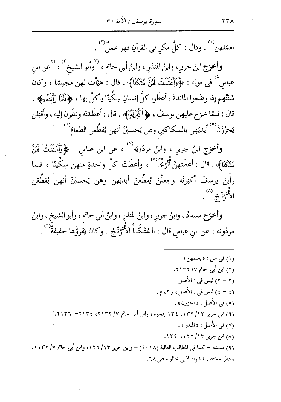 وأخرج ابن جرير ، وَابن المنذر ، وَابن أبي حاتم وأبو الشيخ رضي الله عنه في قوله {وأعتدت لهن متكأ} قال : هيأت لهن مجلسا وكان سنتهم إذا وضعوا المائدة أعطوا كل إنسان سكينا يأكل بها ، فلما رأينه قال : فلما خرج عليهن يوسف عليه السلام {أكبرنه} قال : أعظمنه ونظرن إليه وأقبلن يحززن أيديهن بالسكاكين وهن يحسبن أنهن يقطعن الطعام.