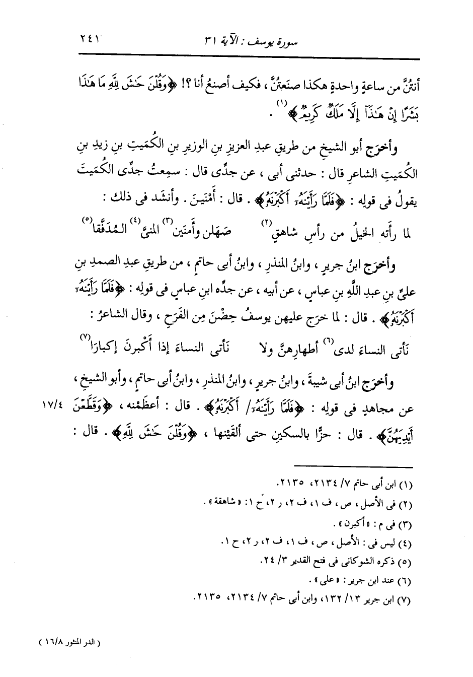 وأخرج ابن أبي شيبة ، وَابن جَرِير ، وَابن المنذر ، وَابن أبي حاتم وأبو الشيخ عن مجاهد رضي الله عنه في قوله {فلما رأينه أكبرنه} قال : أعظمنه {وقطعن أيديهن} قال : حزا بالسكين حتى ألقينها {وقلن حاش لله} قال :