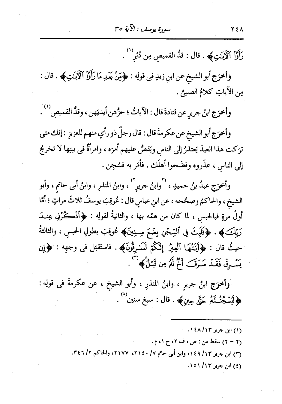 وصححه عن ابن عباس رضي الله عنهما قال : عوقب يوسف عليه السلام ثلاث مرات أما أول مرة فبالحبس لما كان من همه بها والثانية لقوله : اذكرني عند ربك فلبث في السجن بضع سنين عوقب بطول الحبس ، والثالثة حيث قال {أيتها العير إنكم لسارقون} فاستقبل في وجهه {إن يسرق فقد سرق أخ له من قبل}.