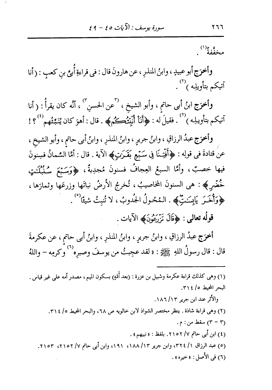 وأخرج أبو عبيد ، وَابن المنذر عن هرون - رضي الله عنه - قال في قراءة أبي بن كعب / {أنا آتيكم بتأويله > /.