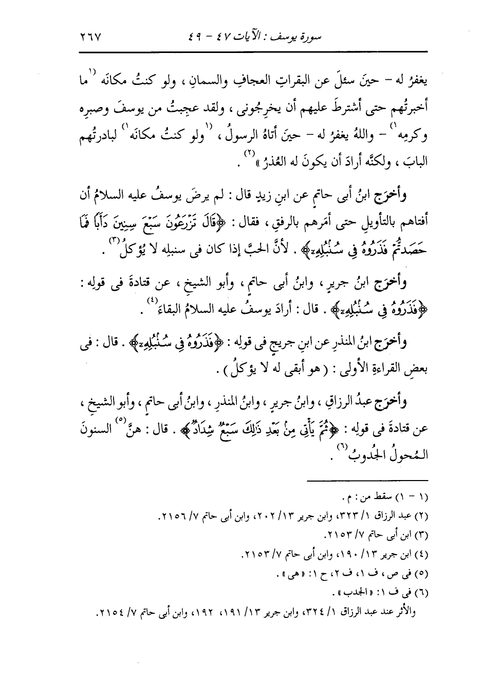 وأخرج ابن جرير ، وَابن أبي حاتم وأبو الشيخ عن قتادة رضي الله عنه في قوله {فذروه في سنبله} قال : أراد يوسف عليه السلام البقاء.