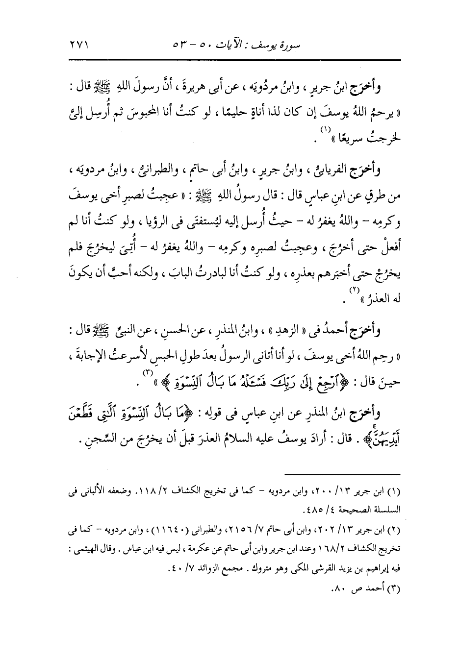وأخرج الفريابي ، وَابن جَرِير ، وَابن أبي حاتم والطبراني ، وَابن مردويه من طرق عن ابن عباس - رضي الله عنهما - قال : قال رسول الله صلى الله عليه وسلم : عجبت لصبر أخي يوسف وكرمه - والله يغفر له - حيث أرسل إليه ليستفتى في الرؤيا وإن كنت أنا لم أفعل حتى أخرج وعجبت من صبره وكرمه - والله يغفر له - أتي ليخرج فلم يخرج حتى أخبرهم بعذره ولو كنت أنا لبادرت الباب ولكنه أحب أن يكون له العذر.