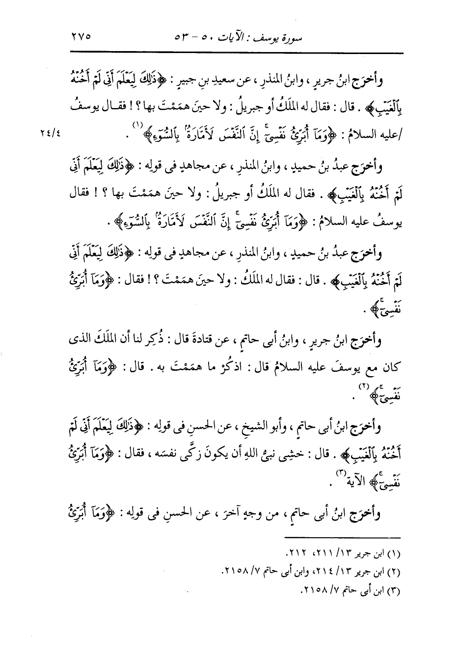 وأخرج ابن جرير ، وَابن المنذر عن سعيد بن جبير - رضي الله عنه - {ذلك ليعلم أني لم أخنه بالغيب} فقال له الملك أو جبريل : ولا حين هممت بها فقال يوسف عليه السلام {وما أبرئ نفسي إن النفس لأمارة بالسوء}.