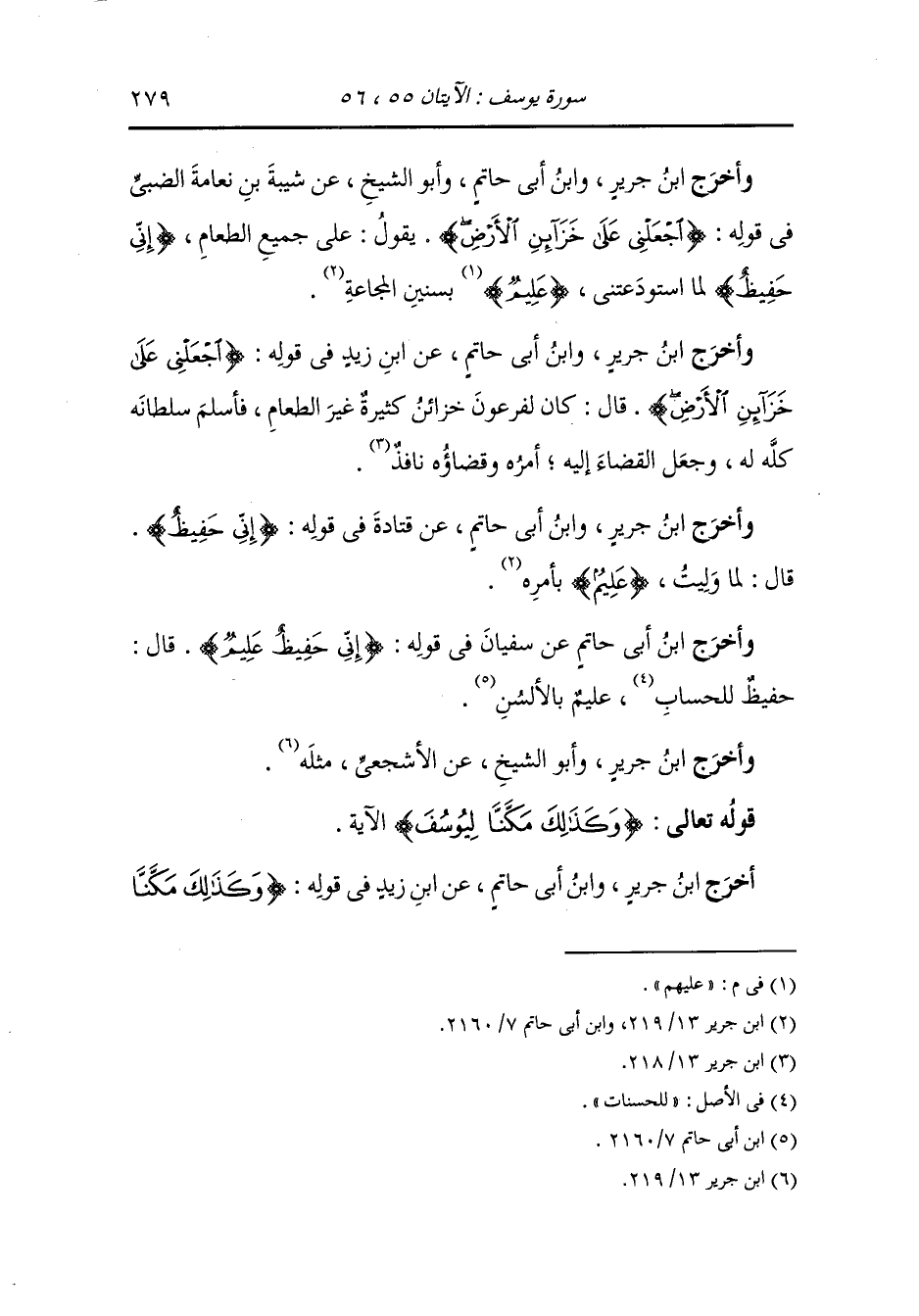 وأخرج ابن جرير ، وَابن أبي حاتم وأبو الشيخ عن شيبة بن نعامة الضبي - رضي الله عنه - في قوله {اجعلني على خزائن الأرض} يقول : على جميع الطعام إني حفيظ لما استودعتني عليهم بسنين المجاعة.