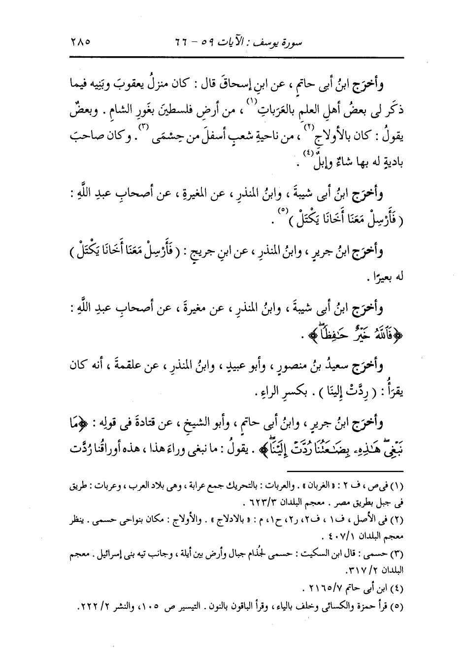 وأخرج ابن أبي حاتم عن ابن إسحاق قال : كان منزل يعقوب وبنيه فيما ذكر لي بعض أهل العلم بالعربات من أرض فلسطين بغور الشام ، وبعض كان يقول بالأدلاج من ناحية شعب أسفل من جسمي وما كان صاحب بادية له بها شاء وإبل.