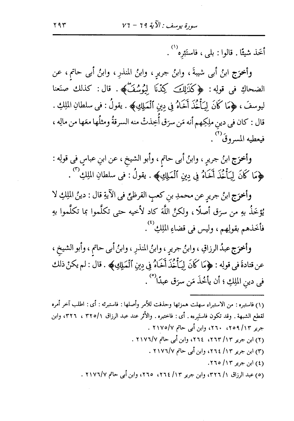 وأخرج عبد الرزاق ، وَابن جَرِير ، وَابن المنذر ، وَابن أبي حاتم وأبو الشيخ عن قتادة رضي الله عنه في قوله {ما كان ليأخذ أخاه في دين الملك} قال : لم يكن ذلك في دين الملك أن يأخذ من سرق عبدا