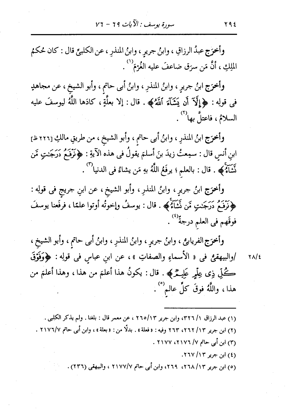 وأخرج ابن المنذر ، وَابن أبي حاتم وأبو الشيخ من طريق مالك بن أنس - رضي الله عنه - قال : سمعت زيد بن أسلم - رضي الله عنه - يقول في هذه الآية {نرفع درجات من نشاء} قال : بالعلم ، يرفع الله به من يشاء في الدنيا.