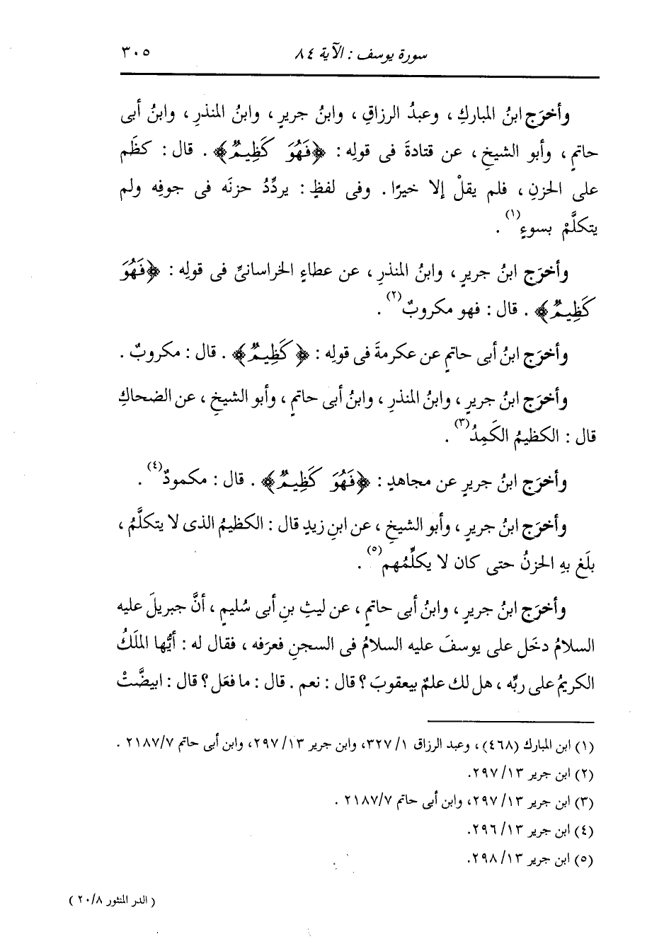 وأخرج ابن المبارك وعبد الرزاق ، وَابن جَرِير ، وَابن المنذر ، وَابن أبي حاتم وأبو الشيخ عن قتادة - رضي الله عنه - في قوله {فهو كظيم} قال : كظم على الحزن فلم يقل إلا خيرا أو في لفظ : يردد حزنه في جوفه ولم يتكلم بسوء.