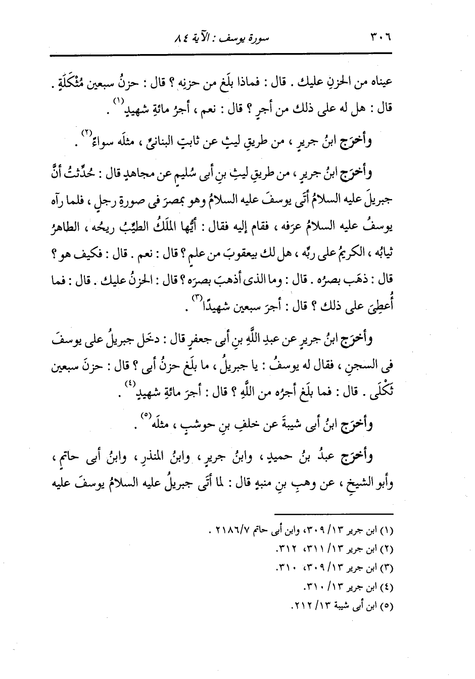 وأخرج ابن جرير عن عبد الله بن أبي جعفر - رضي الله عنه - قال : دخل جبريل عليه السلام على يوسف عليه السلام في السجن فقال له يوسف : يا جبريل ما بلغ من حزن أبي قال : حزن سبعين ثكلى ، قال : فما بلغ أجره من الله قال : أجر مائة شهيد.