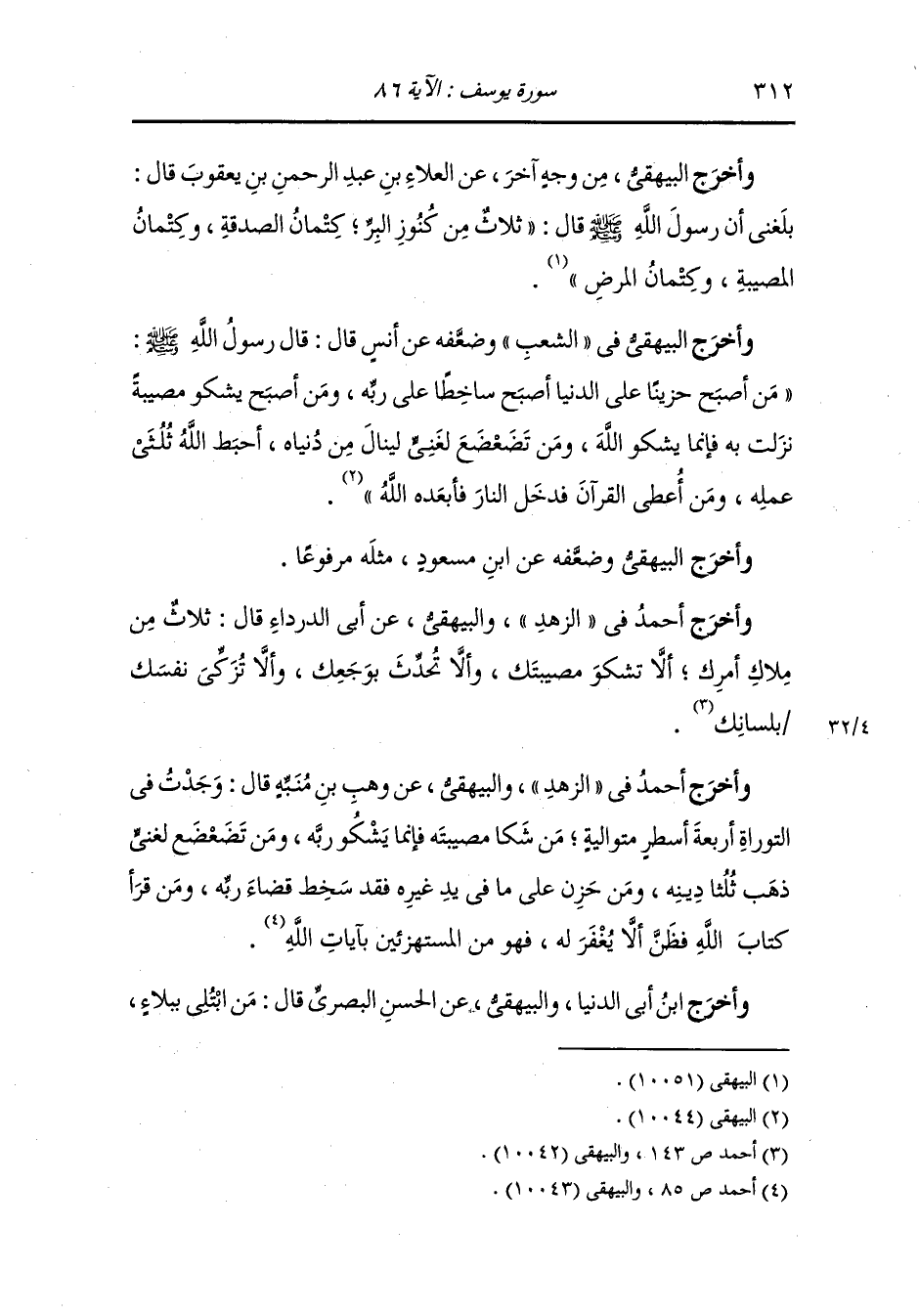 وأخرج أحمد في الزهد والبيهقي عن وهب بن منبه - رضي الله عنه - قال : وجدت في التوراة أربعة أسطر متوالية : من شكا مصيبته فإنما يشكو ربه ومن تضعضع لغني ذهب ثلثا دينه ومن حزن على ما في يد غيره فقد سخط قضاء ربه ومن قرأ كتاب الله فظن أن لا يغفر له فهو من المستهزئين بآيات الله.