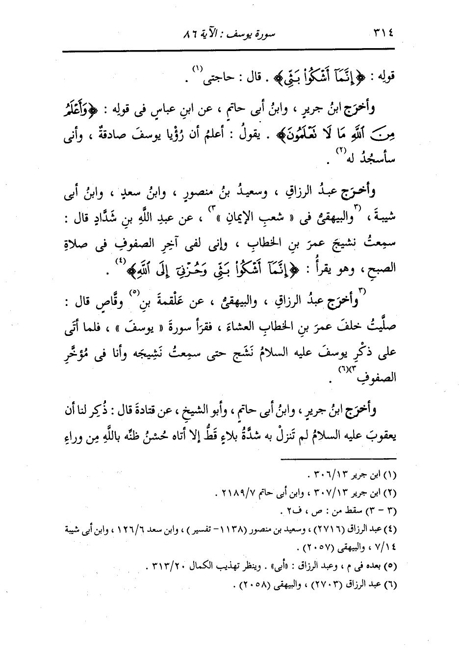 وأخرج عبد الرزاق والبيهقي عن علقمة بن أبي وقاص - رضي الله عنه - قال : صليت خلف عمر بن الخطاب - رضي الله عنه - العشاء فقرأ سورة يوسف عليه السلام فلما أتى على ذكر يوسف عليه السلام نشج حتى سمعت نشيجه وأنا في مؤخر الصفوف.