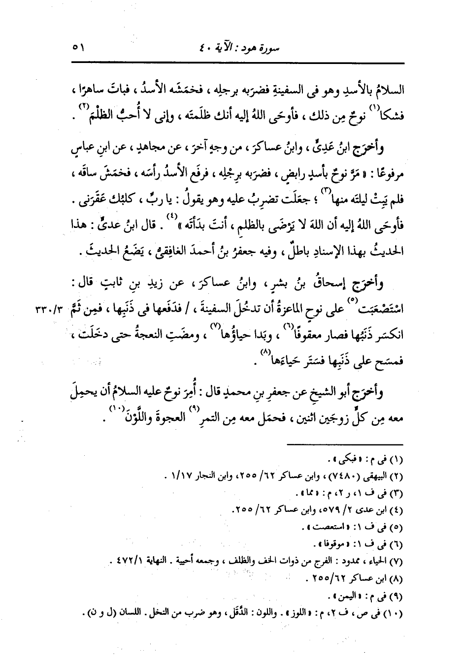 وأخرج ابن عدي ، وَابن عساكر من وجه آخر عن مجاهد عن ابن عباس رضي الله عنهما مرفوعا مر نوح بأسد رابض فضربه برجله فرفع الأسد رأسه فخمش ساقه فلم يبت ليلته مما جعلت تضرب عليه وهو يقول : يا رب كلبك عقرني ، فأوحى الله إليه أن الله لا يرضى الظلم أنت بدأته ، قال ابن عدي : هذا الحديث بهذا الإسناد باطل وفيه جعفر بن أحمد الغافقي يضع الحديث.