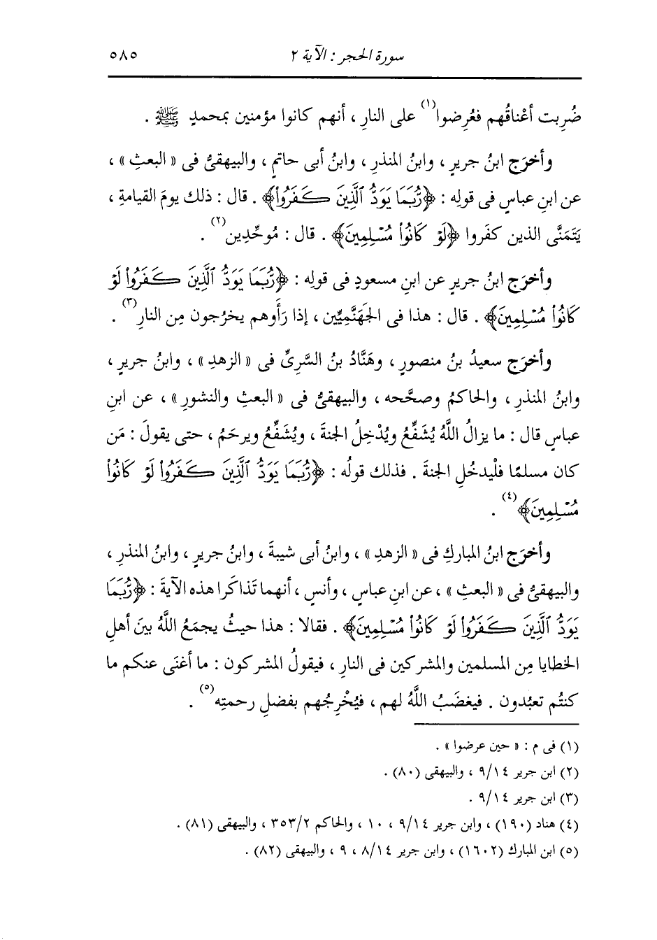 وأخرج سعيد بن منصور وهناد بن السرى في الزهد ، وَابن جَرِير ، وَابن المنذر والحاكم في صححه والبيهقي في البعث والنشور عن ابن عباس رضي الله عنهما قال : ما زال الله يشفع ويدخل الجنة ويشفع ويرحم حتى يقول : من كان مسلما فليدخل الجنة ، فذلك قوله : {ربما يود الذين كفروا لو كانوا مسلمين}.