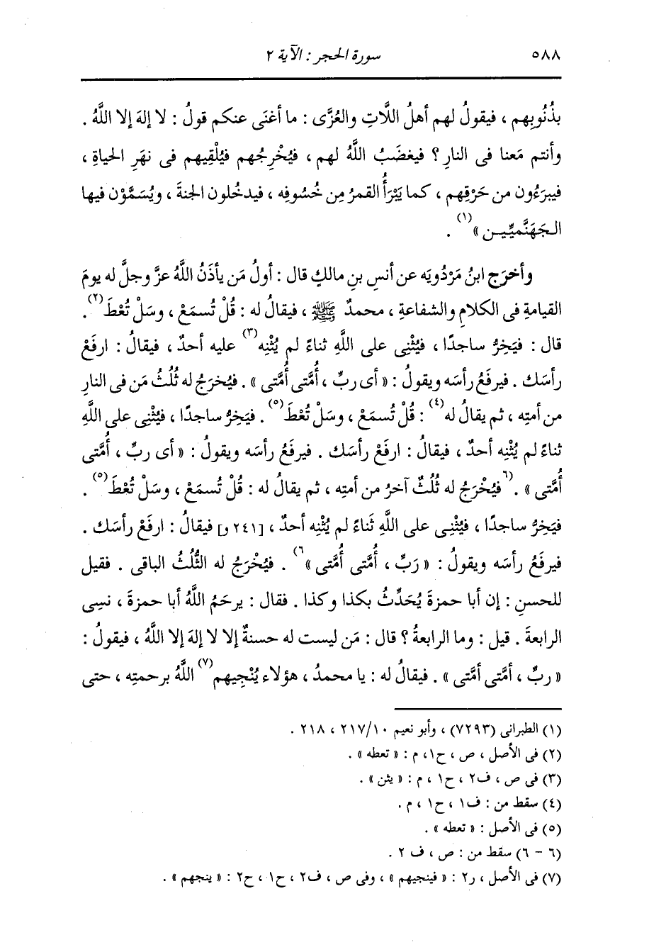 فيثني على الله ثناء لم يثن عليه أحد فيقال : ارفع رأسك ، فيرفع رأسه فيقول : أي رب أمتي ، أمتي ، فيخرج له ثلث من في النار من أمته ثم يقال : قل تسمع وسل تعط ، فيخر ساجدا فيثني على الله ثناء لم يثنه أحد ، فيقال : ارفع رأسك ، فيرفع رأسه ويقول : أي رب أمتي ، أمتي ، فيخرج له ثلث آخر من أمته ثم يقال له : قل تسمع وسل تعط ، فيخر ساجدا فيثني على الله ثناء لم يثنه أحد ، فيقال : ارفع رأسك ، فيرفع رأسه ويقول : رب أمتي ، أمتي ، فيخرج له الثلث الباقي ، فقيل للحسن : إن أبا حمزة يحدث بكذا وكذا ، فقال : يرحم الله أبا حمزة نسي الرابعة ، قيل وما الرابعة قال : من ليست له حسنة إلا لا إله إلا الله ، فيقول : رب أمتي ، أمتي ، فيقال له : يا محمد هؤلاء ينجيهم الله برحمته حتى