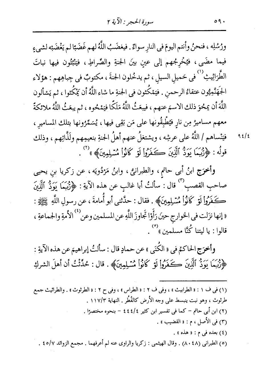 وأخرج ابن أبي حاتم والطبراني ، وَابن مردويه عن زكريا بن يحيى صاحب القضيب قال : سألت أبا غالب رضي الله عنه عن هذه الآية {ربما يود الذين كفروا لو كانوا مسلمين} فقال : حدثني أبو أمامة رضي الله عنه عن رسول الله صلى الله عليه وسلم : إنها نزلت في الخوارج حين رأوا تجاوز الله عن المسلمين وعن هذه الأمة والجماعة قالوا : يا ليتنا كنا مسلمين.