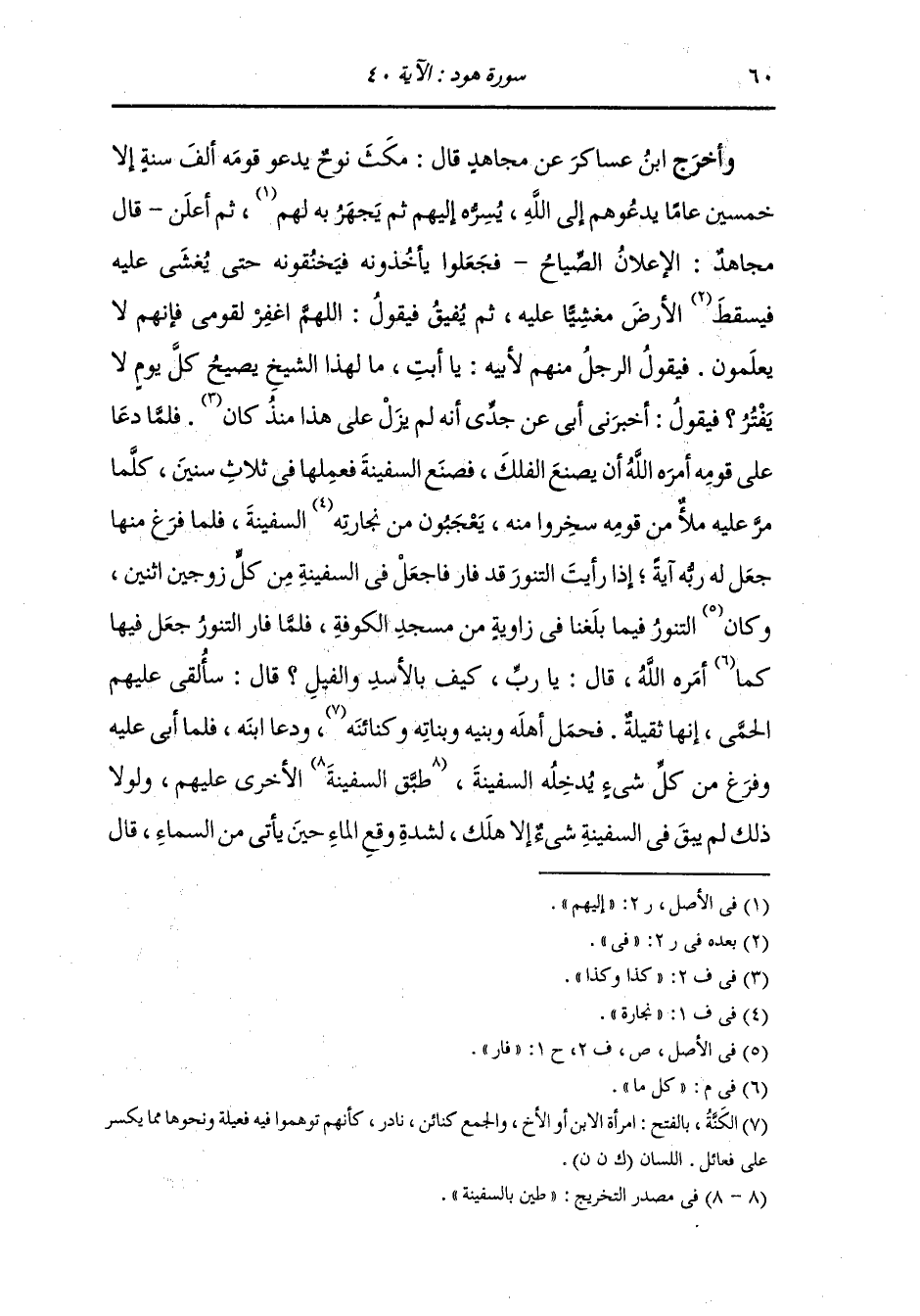 قومه ألف سنة إلا خمسين عاما يدعوهم إلى الله يسره إليهم ثم يجهر به لهم ثم أعلن قال مجاهد رضي الله عنه : الإعلان الصياح : فجعلوا يأخذونه فيخنقونه حتى يغشي عليه فيسقط الأرض مغشيا عليه ثم يفيق فيقول : اللهم اغفر لقومي فإنهم لا يعلمون ، فيقول الرجل منهم لأبيه : يا أبت ما لهذا الشيخ يصيح كل يوم لا يفتر فيقول : أخبرني أبي عن جدي أنه لم يزل على هذا منذ كان فلما دعا على قومه أمره الله أن يصنع الفلك فصنع السفينة فعملها في ثلاث سنين كاما مر عليه ملأ من قومه سخروا منه يعجبون من نجارته السفينة فلما فرغ منها جعل له ربه آية إذا رأيت التنور قد فار فاجعل في السفينة من كل زوجين اثنين وكان التنور فيما بلغني في زاوية من مسجد الكوفة فلما فار التنور جعل فيها كل ما أمره الله قال : يا رب كيف بالأسد والفيل قال : سألقي عليهم الحمى إنها ثقيلة فحمل أهله وبنيه وبناته وكنائنه ودعا ابنه فلما أبى عليه وفرغ من كل شيء يدخله السفينة طبق السفينة الأخرى عليهم ولولا ذلك لم يبق في السفينة شيء إلا هلك لشدة وقع الماء حين يأتي من السماء قال