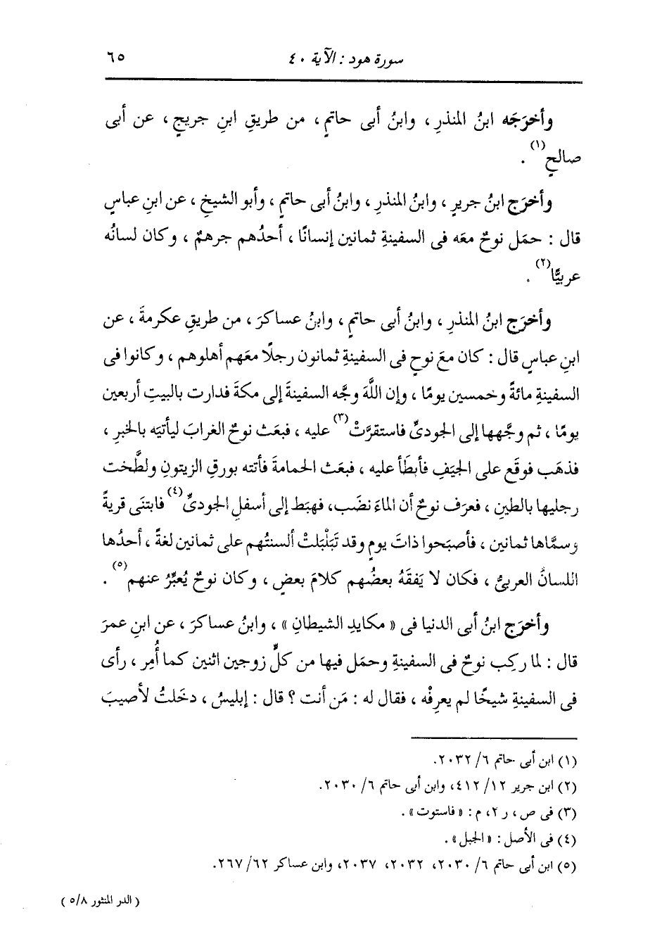 وأخرج ابن المنذر ، وَابن أبي حاتم ، وَابن عساكر من طريق عكرمة عن ابن عباس رضي الله عنهما قال : كان مع نوح في السفينة ثمانون رجلا معهم أهلوهم وكانوا في السفينة مائة وخمسين يوما وإن الله وجه السفينة إلى مكة فدارت بالبيت أربعين يوما ثم وجهها إلى الجودي فاستوت عليه فبعث نوح عليه السلام الغراب ليأتيه بالخبر فذهب فوقع على الجيف فأبطأ عليه فبعث الحمامة فأتته بورق الزيتون ولطخت رجليها بالطين فعرف نوح عليه السلام أن الماء نضب فهبط إلى أسفل الجودي فابتنى قرية وسماها ثمانين فأصبحوا ذات يوم وقد تبلبلت ألسنتهم على ثمانين لغة أحدها اللسان العربي فكان لا يفقه بعضهم كلام بعض وكان نوح عليه السلام يعبر عنهم.