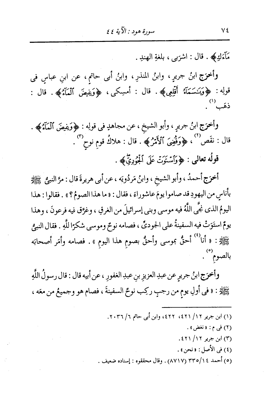 أخرج أحمد وأبو الشيخ ، وَابن مردويه عن أبي هريرة رضي الله عنه قال : مر النَّبِيّ صلى الله عليه وسلم بأناس من اليهود وقد صاموا يوم عاشوراء فقال : ما هذا الصوم فقالوا : هذا اليوم الذي أنجى الله فيه موسى وبني إسرائيل من الغرق وأغرق فيه فرعون وهذا يوم استوت فيه السفينة على الجودي فصامه نوح وموسى عليهما السلام شكرا لله ، فقال صلى الله عليه وسلم : أنا أحق بموسى وأحق بصوم هذا اليوم فصامه وأمر أصحابه بالصوم.