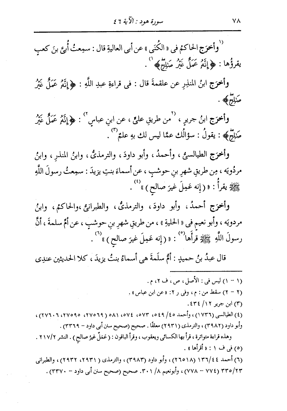 وأخرج أحمد وأبو داود والترمذي والطبراني والحاكم ، وَابن مردويه وأبو نعيم في الحلية من طريق شهر بن حوشب عن أم سلمة رضي الله عنه قال : سمعت رسول الله صلى الله عليه وسلم قرأها {إنه عمل غير صالح}