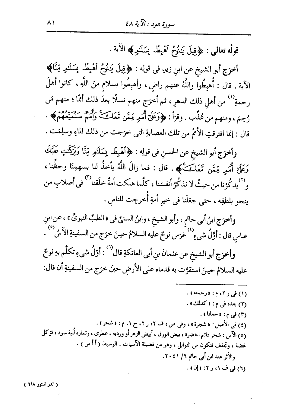 أَخرَج أبو الشيخ عن ابن زيد رضي الله عنه في قوله {قيل يا نوح اهبط بسلام منا} الآية ، قال : اهبطوا والله عنهم راض واهبطوا بسلام من الله كانوا أهل رحمته من أهل ذلك ثم أخرج منهم نسلا بعد ذلك أمما منهم من رحم ومنهم من عذب وقرأ {وعلى أمم ممن معك وأمم سنمتعهم} قال : إنما افترقت الأمم من تلك العصابة التي خرجت من ذلك الماء وسلمت.