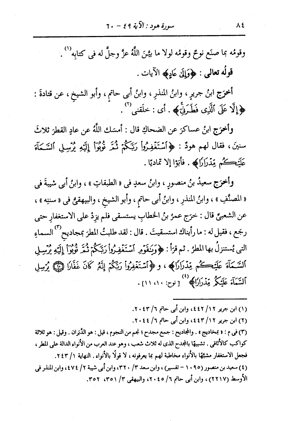 وأخرج ابن عساكر عن الضحاك رضي الله عنه قال : أمسك عن عاد القطر ثلاث سنين فقال لهم هود {استغفروا ربكم ثم توبوا إليه يرسل السماء عليكم مدرارا} فأبوا إلا تماديا.