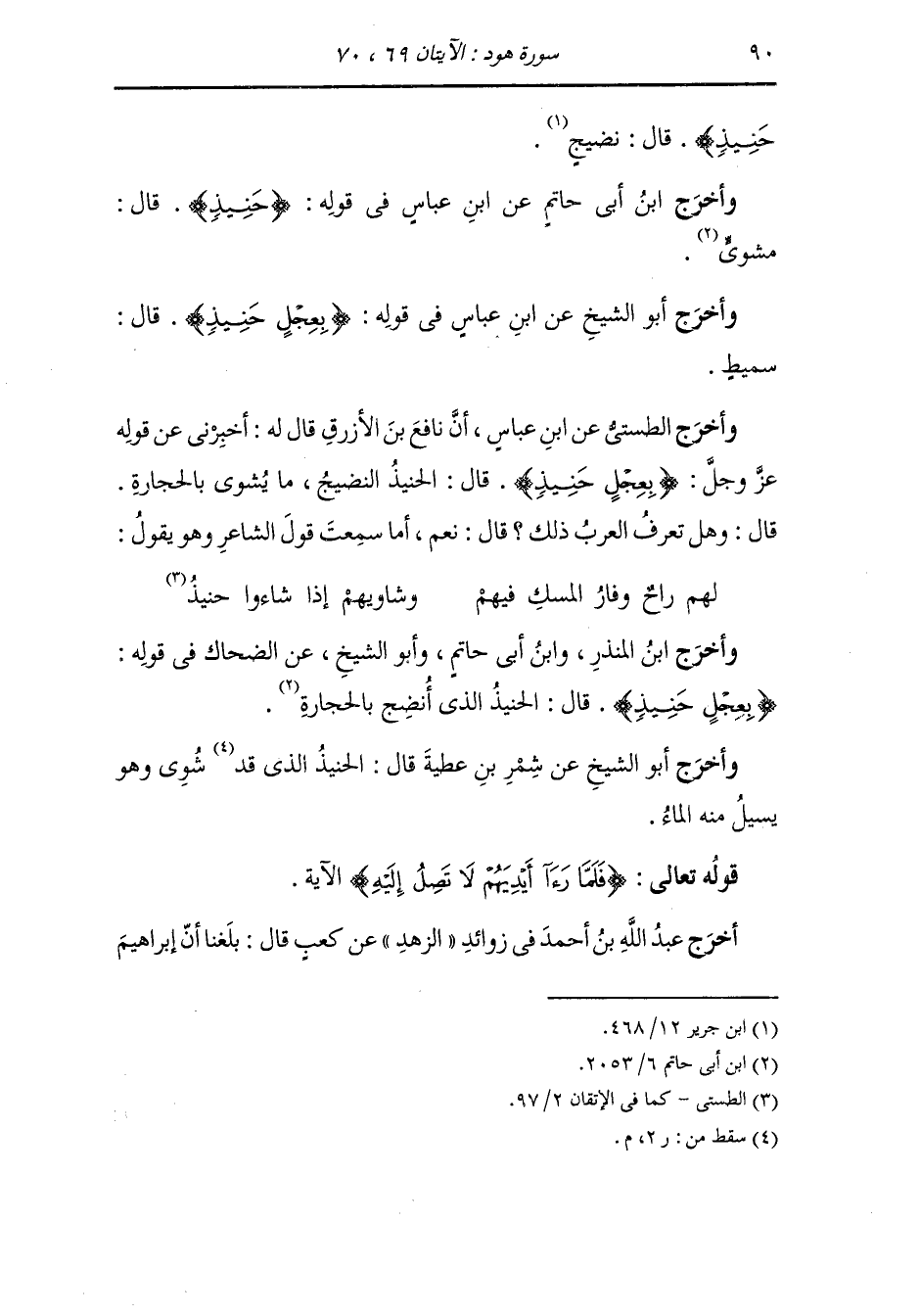 وأخرج الطستي عن ابن عباس : أن نافع بن الأزرق قال له : أخبرني عن قوله عز وجل {بعجل حنيذ} قال : الحنيذ النضيج ما يشوى بالحجارة ، قال : وهل تعرف العرب ذلك قال : نعم أما سمعت قول الشاعر وهو يقول : لهم راح وفار المسك فيهم * وشاوهم إذا شاوا حنيذ.