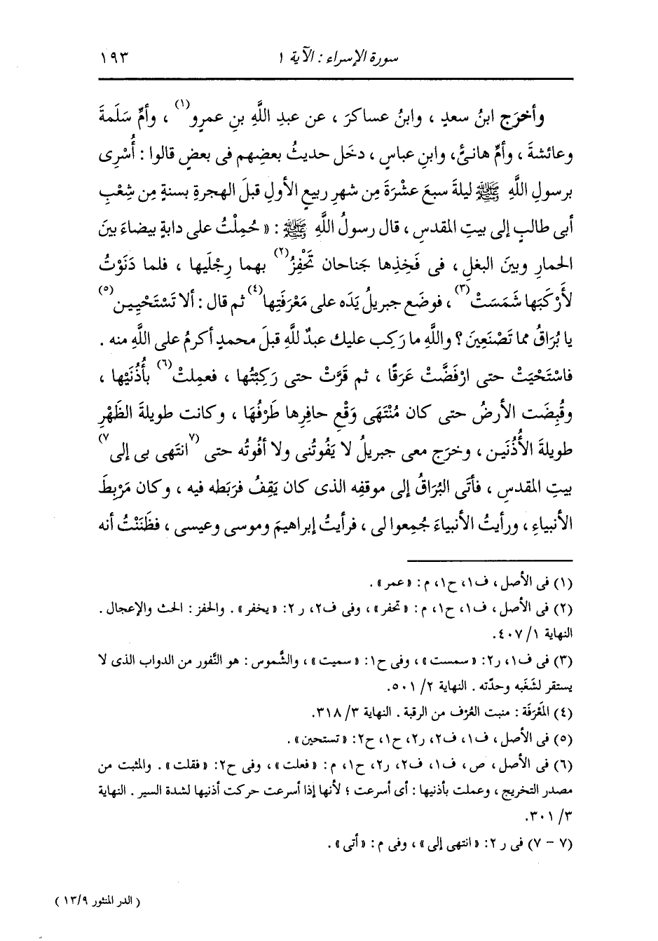 وأخرج ابن سعد ، وَابن عساكر عن عبد الله بن عمر وأم سلمة وعائشة وأم هانئ ، وَابن عباس رضي الله عنهما دخل حديث بعضهم في بعض قالوا : أسري برسول الله صلى الله عليه وسلم ليلة سبع عشرة من شهر ربيع الأول قبل الهجرة بسنة من شعب أبي طالب إلى بيت المقدس ، قال رسول الله صلى الله عليه وسلم : حملت على دابة بيضاء بين الحمار وبين البغل في فخذها جناحان تحفز بهما رجليها فلما دنوت لأركبها شمست فوضع جبريل عليه السلام يده على معرفتها ثم قال : ألا تستحتين يا براق مما تصنعين والله ما ركبك عبد لله قبل محمد أكرم على الله منه فاستحيت حتى ارفضت عرقا ثم قرت حتى ركبتها فعلت بأذنيها وقبضت الأرض حتى كان منتهى وقع حافرها طرفها وكانت طويلة الظهر طويلة الأذنين ، وخرج معي جبريل لا يفوتني ولا أفوته حتى أتى بيت المقدس فأتى البراق إلى موقفه الذي كان يقف فربطه فيه وكان مربط الأنبياء عليهم السلام رأيت الأنبياء جمعوا لي فرأيت إبراهيم وموسى وعيسى فظننت أنه