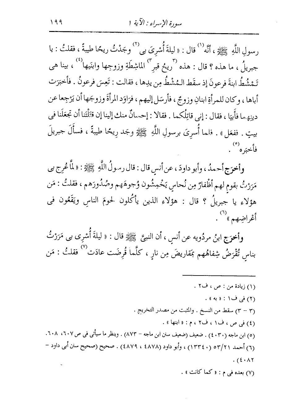 رسول الله صلى الله عليه وسلم قال : ليلة أسري بي وجدت ريحا طيبة فقلت : يا جبريل ما هذه قال : هذه الماشطة وزوجها وابنها بينما هي تمشط ابنة فرعون إذ سقط المشط من يدها فقال : تعس فرعون فأخبرت أباها وكان للمرأة ابنان وزوج فأرسل إليهم فراود المرأة وزوجها أن يرجعا عن دينهما فأبيا فقال : إني قاتلكما : فقالا إحسان منك إلينا إن قتلتنا أن تجعلنا في بيت ففعل فلما أسري برسول الله صلى الله عليه وسلم وجد ريحة طيبة فسال جبريل عليه السلام فأخبره.