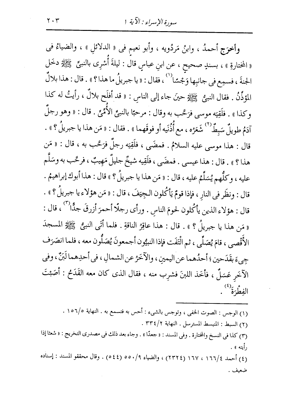 وأخرج أحمد ، وَابن مردويه وأبو نعيم في الدلائل والضياء في المختارة بسند صحيح عن ابن عباس رضي الله عنهما قال : ليلة أسري بالنبي دخل الجنة فسمع في جانبها وجسا فقال : يا جبريل ما هذا فقال : هذا بلال المؤذن ، فقال النَّبِيّ حين جاء إلى الناس : قد أفلح بلال رأيت له كذا وكذا فلقيه موسى عليه الصلاة والسلام فرحب به وقال مرحبا بالنبي الأمي قال : وهو رجل آدم طويل سبط شعره مع أذنيه أو فوقهما فقال : من هذا يا جبريل قال : هذا موسى فمضى فلقيه رجل فرحب به قال : من هذا قال : هذا عيسى عليه السلام فمضى فلقيه شيخ جليل مهيب فرحب به وسلم عليه وكلهم يسلم عليه قال : من هذا يا جبريل قال : أبوك إبراهيم عليه السلام ، قال : ونظر في النار فإذا قوم يأكلون الجيف قال : من هؤلاء يا جبريل قال : هؤلاء الذين يأكلون لحوم الناس ، ورأى رجلا أحمر أزرق جدا قال : من هذا يا جبريل قال : هذا عاقر الناقة فلما أتى النَّبِيّ صلى الله عليه وسلم المسجد الأقصى قام يصلي ثم التفت فإذا النبيون أجمعون يصلون معه فلما انصرف جيء بقدحين أحدهما عن اليمين والآخر عن الشمال في أحدهما لبن وفي الآخرة عسل فأخذ اللبن فشرب منه فقال الذي كان معه القدح : أصبت الفطرة.