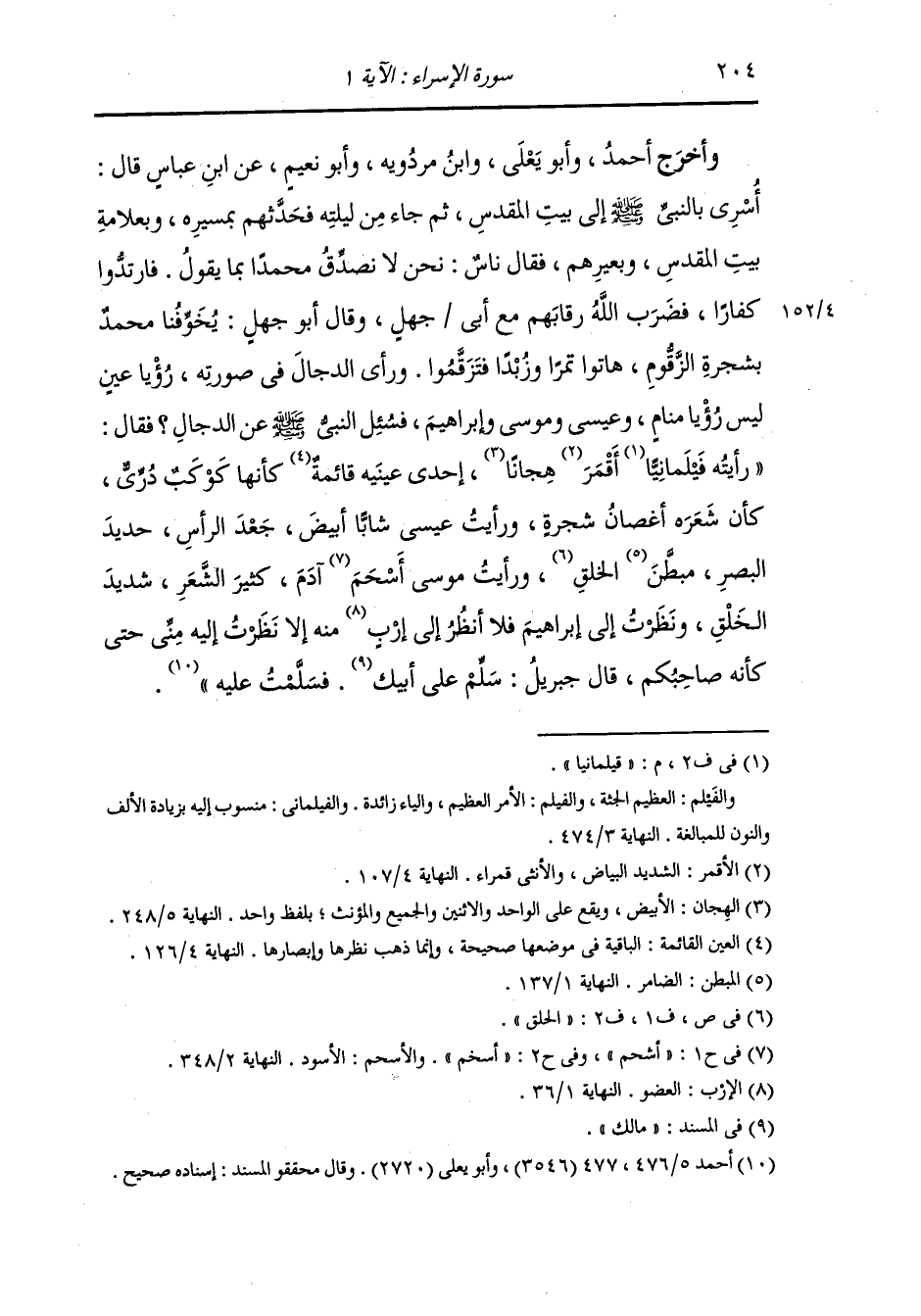 أسري بالنبي صلى الله عليه وسلم إلى بيت المقدس ثم جاء من ليلته فحدثهم بمسيره وبعلامة بيت المقدس وبعيرهم فقال ناس : نحن لا نصدق محمدا بما يقول : فارتدوا كفارا فضرب الله رقابهم مع أبي جهل ، وقال أبو جهل : يخوفنا محمد بشجرة الزقوم هاتوا تمرا وزبدا فتزقموا به ، ورأى الدجال في صورته رؤيا عين ليس برؤيا منام ، وعيسى وموسى وإبراهيم عليهم السلام فسئل النَّبِيّ صلى الله عليه وسلم عن الدجال فقال : رأيته قيلمانيا أقمرهجان إحدى عينيه قائمة كأنها كوكب دري كأن شعره أغصان شجرة ، ورأيت عيسى عليه السلام شابا أبيض جعد الرأس حديد البصر مبطن الخلق ورأيت موسى أسحم آدم كثير الشعر شديد الخلق ونظرت إلى إبراهيم عليه السلام فلا أنظر إلى أرب منه إلا نظرت إليه مني حتى كأنه صاحبكم قال جبريل عليه السلام سلم على أبيك فسلمت عليه.