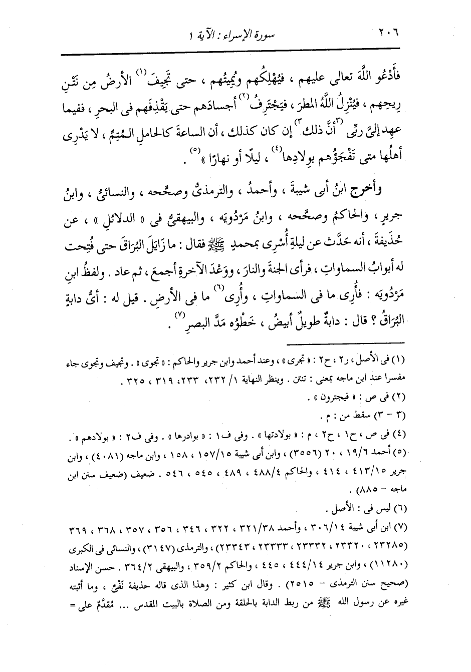 وأخرج ابن أبي شيبة وأحمد والترمذي وصححه والنسائي ، وَابن جَرِير والحاكم وصححه ، وَابن مردويه والبيهقي في الدلائل عن حذيفة رضي الله عنه أنه حدث عن ليلة أسري بمحمد صلى الله عليه وسلم فقال : ما زايل البراق حتى فتحت له أبواب السماوات فرأى الجنة والنار ووعد الآخرة أجمع ثم عاد ولفظ ابن مردويه فأري ما في السماوات وأري ما في الأرض قيل له أي دابة البراق قال : دابة طويل أبيض خطوه مد البصر.