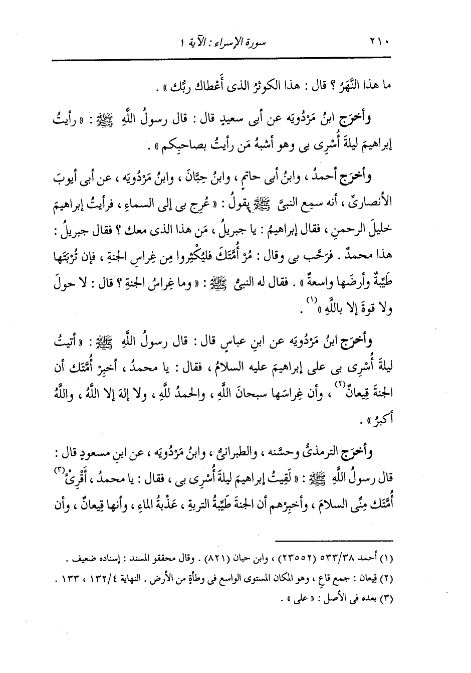 وأخرج الترمذي وحسنه والطبراني ، وَابن مردويه عن ابن مسعود رضي الله عنه قال : قال رسول الله صلى الله عليه وسلم : لقيت إبراهيم ليلة أسري بي فقال : يا محمد أقرئ أمتك مني السلام وأخبرهم أن الجنة طيبة التربة عذبة الماء وأنها قيعان وأن